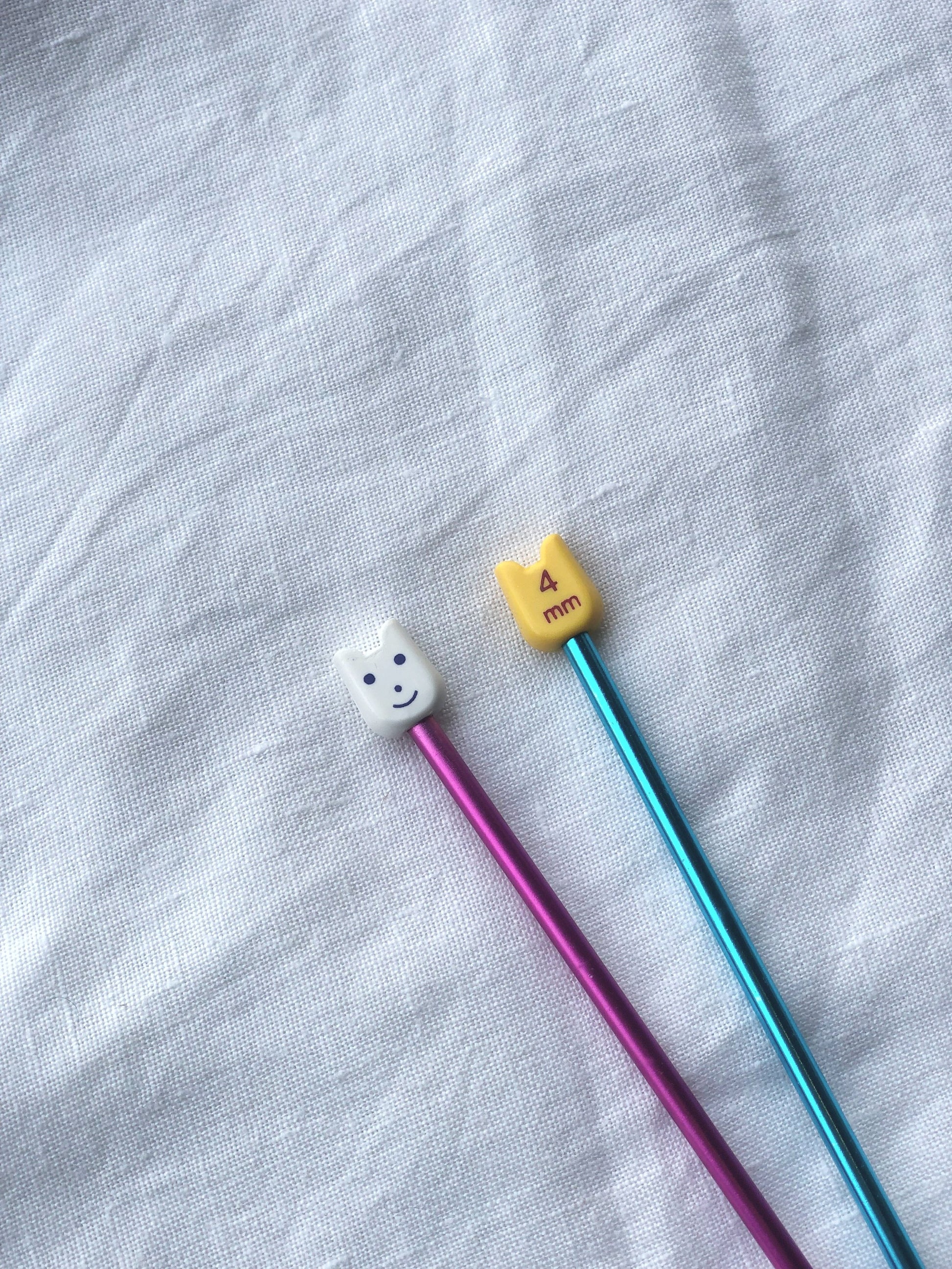 These needles are slightly shorter, for ease of use in smaller hands. They're colour-coded aluminium, so they're nice and slippery for all those ultra-tight first stitches. The colour coding, well, that just makes it easier to explain that you pass from blue to red, or "check your red needle, count your stitches".