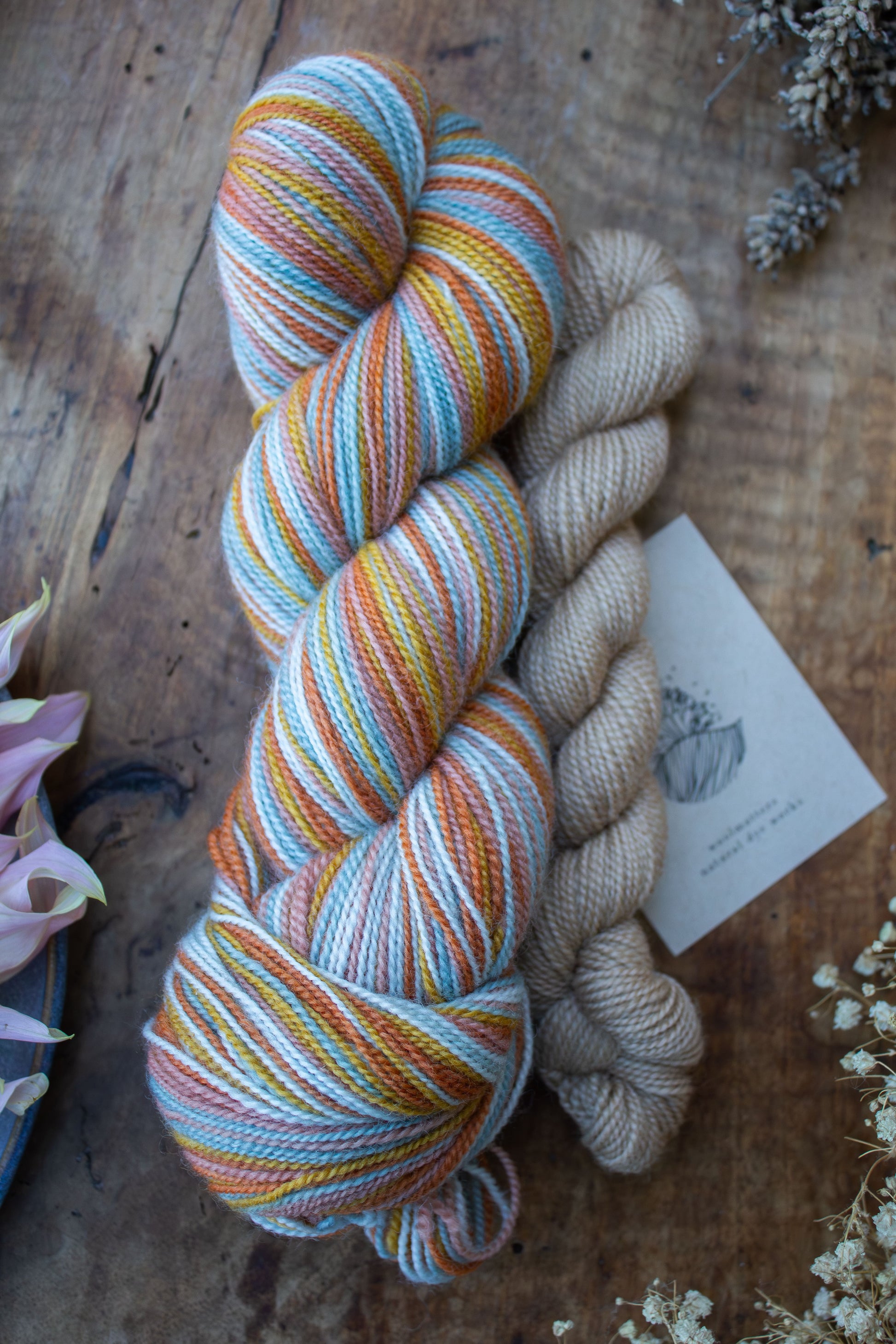 These self-striping sock yarns by Woolmatters are an absolute joy! They knit up into your perfect stripy sock, all created through a unique dyeing technique Alice and her partner have devised especially for this project. All colour is created using natural dyes, many of them coming from Alice's garden in Clevedon, which is only about half an hour drive from our shop, a local yarn at it's finest! These come in 3 different colourways and are sold as a set of one 100g skein of self-striping yarn together with a solid colour 20g mini skein for contrasting heels/ toes. The yarn is Woolmatters' signature sock base: a 100% Corriedale yarn spun with a high twist for extra durability, fully natural, plastic-free and non-superwash! Treat yourself to some wonderfully stripy socks in one of a kind earthy hues!